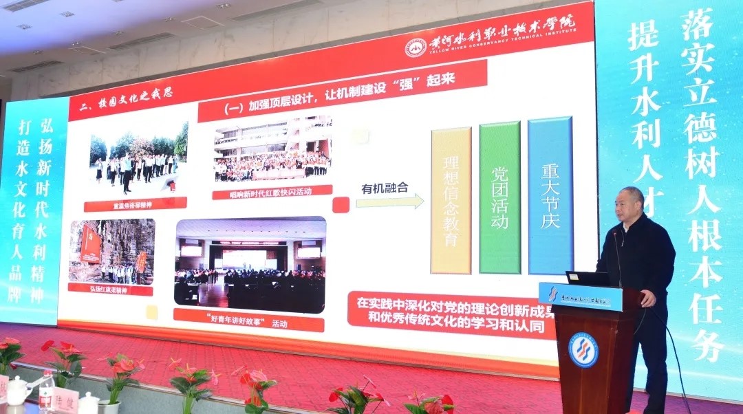 11月27日,全国水利院校第一届水文化育人研讨会在重庆水利电力职业技术学院举行,我校副校长杨士恒受邀参加了本次会议。中国水利教育协会会长黄河、中国水利教育协会秘书长王韶华、重庆市相关领导,以及来自全国25所水利院校的主要领导、分管校领导、相关部门负责人和重庆水电职院的师生代表共计400余人参加会议。杨士恒以“润物无声处 培根铸魂时”为题,代表我校做了交流发言。