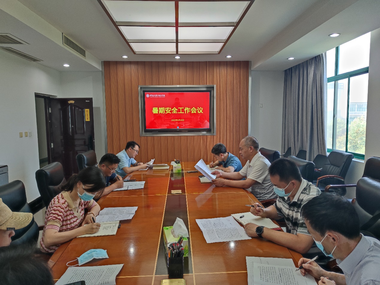 杨士恒指出,暑期将至,暑期也是高温、大风、暴雨等自然灾害的高发期,各部门要做好应对极端天气的各项准备工作,做好安全排查工作。学生工作部制作“暑期安全提醒卡”并督促各个辅导员通知到每一位学生;教师工作部要对教职工加强教育引导,做好安全提醒工作;后勤管理服务中心对学校的排水管网要及时进行清理疏通,对学校开水房锅炉和饮用管网进行清洗、清理、消毒工作。