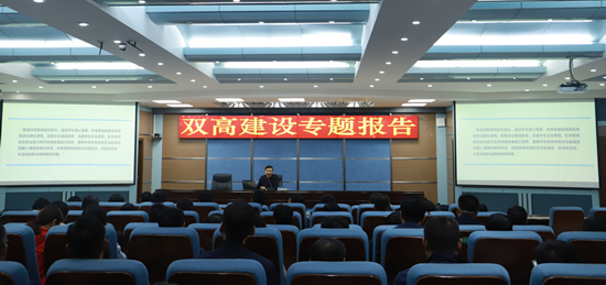 报告会上,董刚教授介绍了国家“双高计划”项目的出台背景、项目申报、立项情况,对我国近年来一系列职教文件精神、高职教育发展定位和支撑国家经济社会发展战略进行了详实解读。他指出,“双高计划”以提高高职办学质量、培养高水平职业技术人才为目的,是大力发展高等职业教育,为企业发展提供高质量的职业技术人才的有效措施,是实现职业教育现代化的战略举措。他结合具体案例深刻剖析了高水平专业群是打造技术技能人才培养高地的核心,强调要充分发挥专业群的集聚效应和服务功能,实现人才培养供给侧和产业需求侧结构要素全方位融合。他阐释了加强应用研究技术服务是打造技术技能创新服务平台的关键,强调高职院校要对接科技发展趋势,深入挖掘自身潜力,以技术技能积累为纽带,建设集人才培养、团队建设、技术服务于一体,资源共享、机制灵活、产出高效的人才培养与技术创新平台,提升高职院校人才培养和社会服务效能,增强高职教育技术研发和应用的能力。他还结合多年来从事职业教育的丰富经验,为我校“双高校”建设下一步完善方案、落实任务、推动高水平建设,提出了宝贵建议。