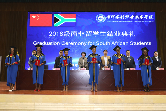 我校校友、企业代表平帅军发言,对能为母校国际化办学做出贡献感到骄傲,希望能继续深化校企合作,培养更多的国际高技能应用型人才。任课教师代表张芳回顾了留学生在学习过程中的付出与收获,并给予其美好的祝福。2018级南非留学生代表西蒙对学校和老师的辛勤付出表示由衷的感谢,并表示要把所学专业知识运用到南非水利事业的发展中,成为中南友谊的使者。与会领导依次为全体南非留学生颁发结业证书。