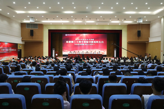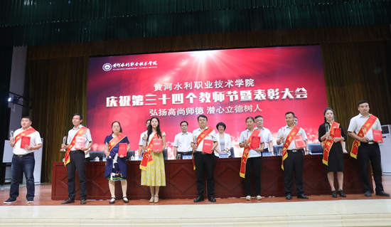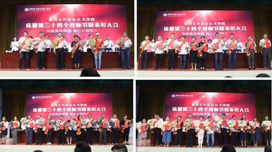大会在奏唱国歌中拉开序幕。王卫东、菅浩然、焦爱萍、刘卫锋分别宣读了《关于表彰2018年开封市优秀教师、优秀教育工作者的决定》《关于表彰2018年优秀教师、优秀教育工作者的决定》《关于表彰2018年从事教育教学工作满三十年教师的决定》《关于表彰2018年学生技能大赛优秀指导教师的决定》《关于表彰2018年最美水院人的决定》,校领导向受表彰的教师进行了颁奖。中原教学名师、河南省2018年国家“万人计划”教学名师候选人王勤香,优秀教师代表朱曙光,优秀校友代表孔晓东,学生代表申君等分别进行了发言。