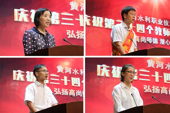 许琰代表校党委向全体教职员工致以节日的问候,向受表彰的优秀个人表示热烈的祝贺,并以《弘扬高尚师德 潜心立德树人》为题发表重要讲话。他从深化教育教学改革,各类大赛捷报频传;营造浓厚学术氛围,科研技术服务能力不断提升;提高人才培养质量,办学影响力显著提升;服务国家“一带一路”倡议,国际交流与合作水平再上新台阶;深化产教融合,校企合作成果丰硕等五个方面回顾了一年来学校所取得的成绩,对默默奉献、辛勤工作的学校广大师生致以崇高敬意。