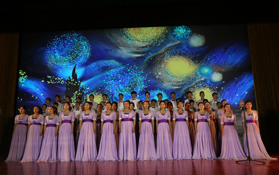 演出结束后,校领导上台与演职人员合影留念,感谢他们为毕业生奉献了一台精彩绝伦的告别演出。(供图:党委宣传部 郝迪婧 徐帅)