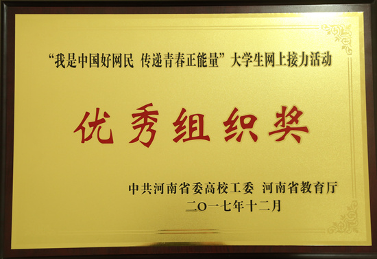 12月26日下午,“我是中国好网民 传递青春正能量”活动暨2017“感动中原”年度教育人物颁奖典礼在河南大学百年大礼堂举行。河南省委高校工委专职副书记、省教育厅党组副书记郑邦山,河南省委网信办副主任蔡新民,河南省委高校工委专职委员陈垠亭等领导出席典礼,全省各地市教育行政部门分管领导、各高校分管思政工作的副书记和宣传部部长、获奖教师代表与会。大会对2017“感动中原”年度教育人物、网上接力活动先进集体和个人代表进行表彰。我校荣获“我是中国好网民 传递青春正能量”活动优秀组织奖。我校党委副书记刘卫锋参会,并代表学校领奖。