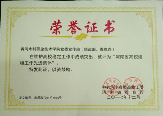 12月8日,省委高校工委、省教育厅召开全省高校维稳工作会议,对2017年全省高校维稳工作进行了总结和表彰。我校被评为“河南省高校维稳工作先进集体”,于兆国和宋杰同志被授予“维稳工作先进个人”荣誉称号。