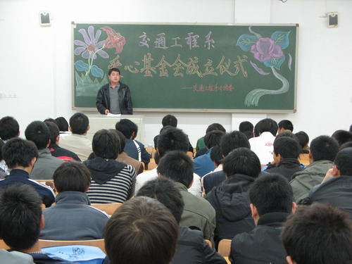 1121,交通工程系举办了“交通工程系爱心基金会成立仪式”活动。系党总支副书记杜广平、分团委书记兼爱心基金会名誉会长焦东良和200余名学生代表参加了成立仪式。