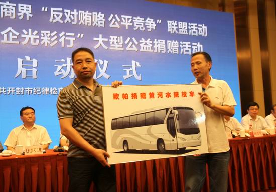 本次会议旨在在全市工商界倡导“反对贿赂、公平竞争”的健康市场环境,弘扬“义利兼顾、以义为先”的文化理念,并通过捐赠善款及物资折款总计1026万元,助推开封文化、教育事业发展。会上,市工商联主席、市总商会会长朱太忠及各位副主席、副会长在联盟活动启动仪式上共同发出倡议,倡议全市企业、商会及协会组织以质量为本、反对贿赂行为,共创公平竞争的市场环境。随后,市委书记祁金立为捐赠企业代表颁发了捐赠证书。开封欧帕自动化有限公司范红兵总经理向我院捐赠了价值40余万元的校车。