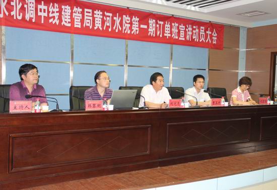 5月25日上午,由南水北调中线建管局主办的“南水北调中线黄河水院订单班”第一期学员选拔宣讲动员大会在我院学术报告厅举行。南水北调中线建管局副局长刘宪亮、人力资源部人事处处长曹玉升、工程运行管理部综合与调度处处长韩黎明,我院副院长刘紫婷、科研外事处处长张春满、教务处处长焦爱萍、水利系主任罗全胜、信息工程系主任丁爱萍、机电工程系书记来卫东、科研外事处副处长陈琳等和学院水利水电建筑工程专业、机电一体化专业、计算机网络技术专业260名学生参加了宣讲会。会议由张春满主持。