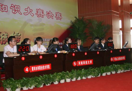 本次决赛共有来自全省各高校的36个代表队,我院组成了以单润涛为领队,胡引生、单润涛两人为指导教师,环化系食品1001班付军伟、管理系电子商务1101班王敏、王喜喜、水利系水工1007班赵连珍为队员的参赛队。516日,队员们按时报到后,就积极的联系承办单位到比赛场地熟悉抢答器,对各个抢答器的特点做到心中有数。517赛前,胡引生老师对4名队员进行了赛前的指导,分析了比赛场上可能遇到的各类情况制定了相应对策,决定由付军伟、王敏、王喜喜3名同学参加本场比赛。