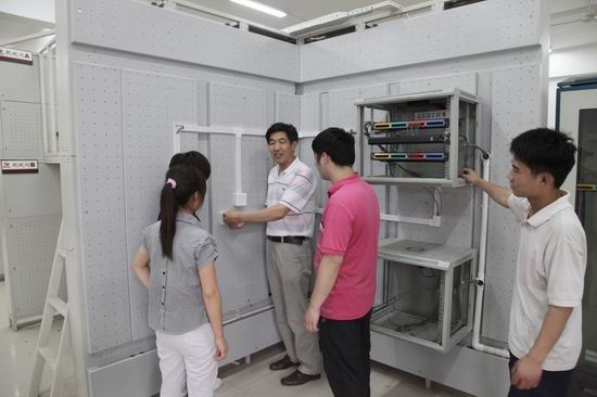 图为机电系师生在加工综合布线楼体装置