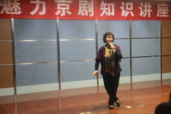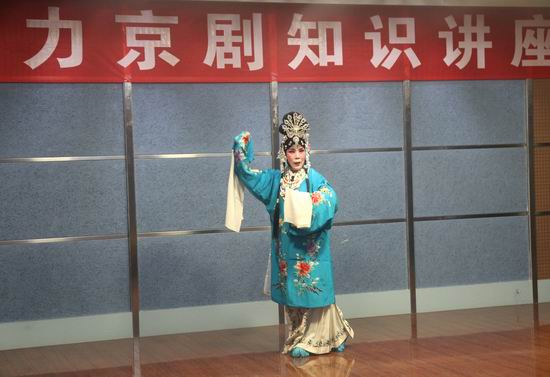 讲解后,张淑华、郑丽君老师分别为师生现场演唱了昆曲《牡丹亭.游园》杜丽娘唱段和京剧《西厢记》崔莺莺的唱段,两人甜美的嗓音、优雅的身段,精湛的表演令大家叹为观止,充分感受到了中国传统文化艺术形式京剧的巨大魅力。