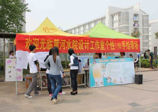 春日和煦,422日,信息工程系“影像之旅”工作室创业团队联合艺术系“黄河水院”设计工作室在扬帆大道举办了“手绘T恤,手绘帆布鞋”展览。