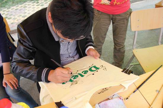 两系同学发挥专业特长,展览自己亲自设计的T恤,帆布鞋。不少过往同学纷纷驻足,被一件件匠心独具的作品所吸引。在得知展出的T恤都可出售之时,一位同学抑制不住欣喜之情,当场付款。展览还根据同学们心中的模板来设计独一无二的T恤,极大满足了同学们的个性需求。活动现场,有的同学受到绘画气氛的影响,选择购买空白T恤,由主办方提供颜料当场自己涂鸦作画,亲身体验绘画的乐趣。