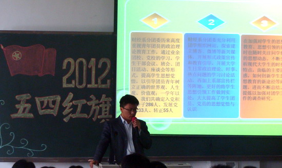 为进一步加强学院共青团组织的自身建设,充分调动全院各级团组织及共青团员的积极性,促进我院团的工作深入发展,4月27日下午,我院在6203教室举行必赢官方网站2011-2012年度“五四红旗分团委”评选现场展示活动。院团委书记周志琦、副书记谷献晖和14个系分团委书记参加了会议。