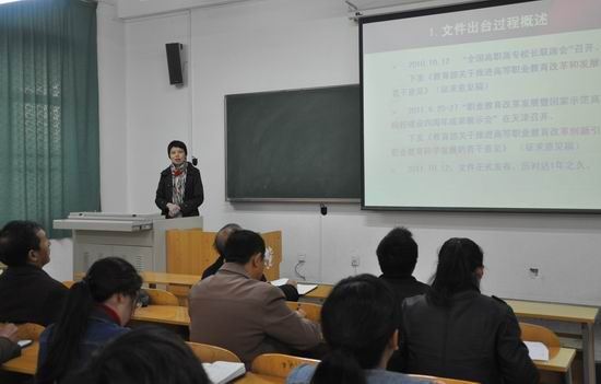 首先,支部书记焦爱萍对近期教育部出台的几个重要指导性文件的背景、主要内容等进行简介,并带领全体人员认真学习了《关于推进高等职业教育改革创新引领职业教育科学发展的若干意见文件》全文。焦爱萍结合文件深入分析了国家十二五规划纲要及《国家中长期教育改革和发展规划纲要(2010-2020年)》对职业教育提出的新的要求;阐述了职业教育面临的新形势和高职在建设现代职业教育体系中的地位、作用和新时期的新任务;并结合我院教育教学改革发展情况对今后工作提出意见和建议。