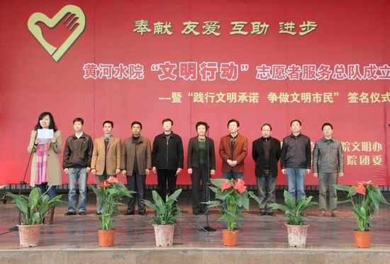 329日,我院“文明行动”志愿者服务总队成立暨“践行文明承诺、争做文明市民”签名仪式在风雨球场隆重举行。院党委书记张惠贞、党委副书记王卫东出席仪式,院宣传部、学工部、团委、水利系、测绘系负责人参加了仪式。仪式由院团委副书记谷献晖主持。