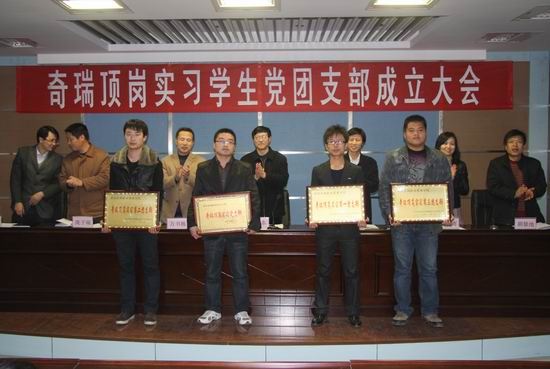 会上,庞子瑞副书记和谷献晖副书记分别宣读了奇瑞顶岗实习学生党支部成员名单和奇瑞顶岗实习学生团支部成员名单。随后,王卫东书记和奇瑞开封张振祥部长,谷献晖、万书栋分别向学生党支部和3个团支部授牌。