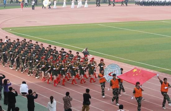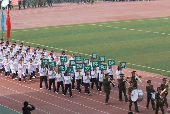上午8点30分,伴随着激昂的运动员进行曲,国旗护卫队和彩旗队首先入场,他们以飒爽的英姿守护着鲜艳的五星红旗,迈着整齐矫健的步伐,喊着铿锵有力的口号,精神饱满的从主席台前走过,拉开了此次大会的帷幕。随后,全院14个系部代表队迈着整齐有序的步伐相继入场。他们身着整齐的服装,踏着欢快的军乐,展现着各系独有的活力与特色,充分彰显了我院学子昂扬的精神风貌。环化系方阵打出了“绿色、环保、健康、和谐”等口号,既展现了系办学特点,也倡导了环保健康的人文观念;土木系的地球莲花模型,突出了独特的建筑风格;测绘系的女子方阵身着女式迷彩军装,英姿飒爽,表现着巾帼不让须眉的昂扬士气;财经系和管理系方阵以一群直飞云天的白鸽,赢得了现场观众的阵阵欢呼;信息工程系方阵将网络游戏中的动漫人物带到了现实,充分展示了动漫游戏专业的特色;旅游系、艺术系方队色彩缤纷的着装则给人以亮丽清新的感觉。