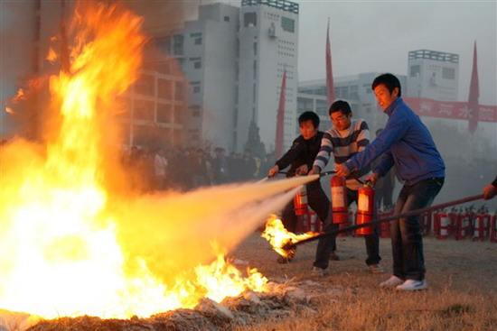 随后,在保卫处工作人员的指导下,部分师生员工按部门、班级顺序依次进行了灭火实战演练。