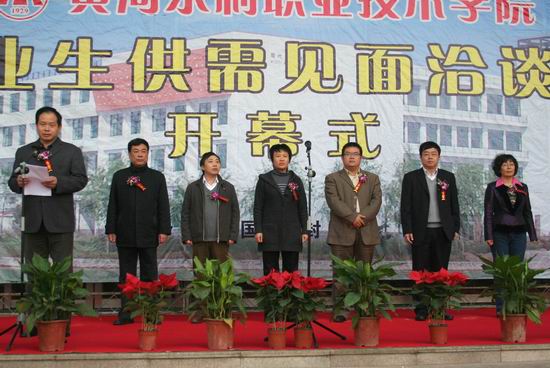 1118日上午,黄河水院2011届毕业生双向选择洽谈会开幕式在我院思源路隆重举行。河南省教育厅就业中心市场部主任段敏、我院党委书记张惠贞、院长刘国际、副院长孙五继、刘紫婷及企业代表中水十六局人力资源部副主任钟登梁出席开幕式。开幕式由党政办主任杨士恒主持。