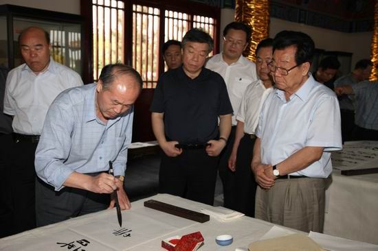 图为李瑞环同志(右一)在笔会观看宗致远现场挥毫。