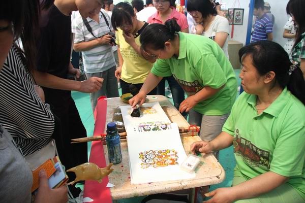 当天上午,活动展示了我市7项国家级非物质文化遗产保护项目和23项省级非物质文化遗产保护项目。巧夺天工的开封汴绣、享誉中外的朱仙镇木版年画、栩栩如生的神嘴马大吹糖人儿、汴京灯笼张、剪纸艺术等一批具有代表性的非物质文化遗产项目作了现场展示,许多项目还邀请观众现场参与这些技艺和成品的制作。这些富有民族文化气息、各具传统文化特色的项目引起了我院师生的浓厚兴趣和高度关注,大家纷纷驻足观看,有些师生还围在马大吹、灯笼张等艺人身边,向他们请教并直接动手制作起来。