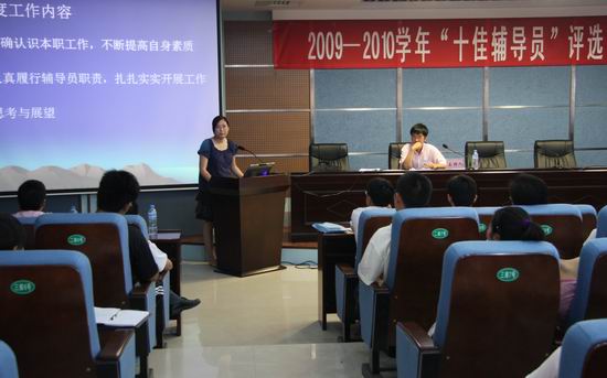 下午,我院“十佳辅导员”评选述职答辩会如期举行,来自各系部的18位候选人参加了述职答辩。本次评选由各系选拔推荐候选人,评委们根据每位候选人的工作材料、现场述职和答辩等情况进行综合评分,最终评选出我院2009-2010学年“十佳辅导员”