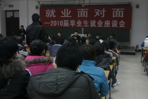 12月8日下午,由招生就业中心主办的“就业面对面——2010届毕业生就业座谈会”在教学楼6202举行。招生就业中心主任于兆国、副主任李纪宾,招生就业中心工作人员和各系部工学结合办主任、学生代表等共200余人参加了座谈会。