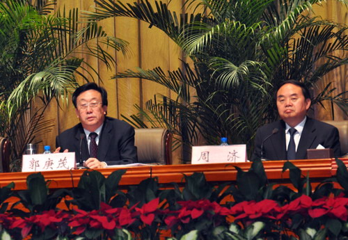 周济在讲话中首先代表教育部向受表彰的先进单位表示祝贺。他说,一年来,经过努力,河南省职业教育攻坚计划和试验区计划的蓝图正在分步骤、有计划地变为现实,河南省在职业教育的改革和发展方面走在了全国前列,对此表示祝贺。周济强调,要站在新的历史起点上,加快推动职业教育由注重扩大规模到全面提高质量的历史性转折。他指出,当前我国正在制定《国家中长期教育改革发展的规划纲要》,主要是确定到2020年中国教育改革发展的目标和措施,在确定将实施的十大工程项目、十大改革试点中,河南省国家职业教育改革试验区是其中的一个重要内容,教育部愿意和河南省携起手来,共同推进河南省各级各类教育的科学发展。相信在党中央、国务院以及河南省委、省政府的领导下,河南省的职业教育攻坚目标一定能够如期实现。