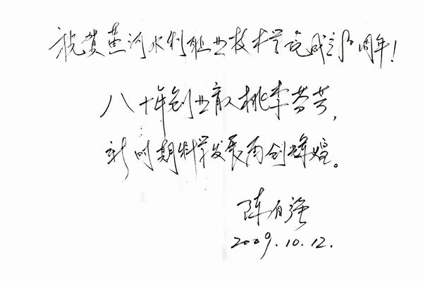 中国水利教育协会副会长、水利部原人教司司长陈自强为学院校庆题词