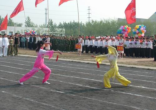 随后我院有关社团进行了文体表演。柔中带刚的舞剑表演,精妙绝伦、柔美和谐的太极表演和轻松柔和、节奏欢快的搏击操完美结合,刚柔并济,博得了同学们的阵阵掌声。