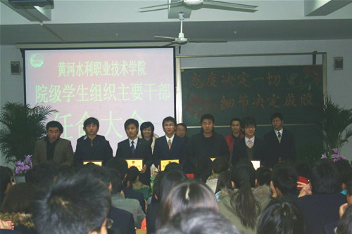 后谷献晖老师宣读了2008年院级学生组织主要干部聘任决定,并向他们表示祝贺。朱焕立老师宣读了2007-2008年度优秀学生分会及优秀部室表彰决定,并为获奖单位和上届优秀学生会干部颁发了奖品。