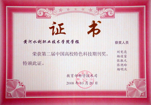 今年10月,教育部组织对我国高校数千种科技期刊进行评比,评选出“第二届中国高校特色科技期刊”,我院学报再度获得“中国高校特色科技期刊”奖,是全国1200余所高职院校唯一获奖者,是河南省84所高校学报中的4个获奖者之一;学报编辑部获得中国高校科技期刊先进集体。