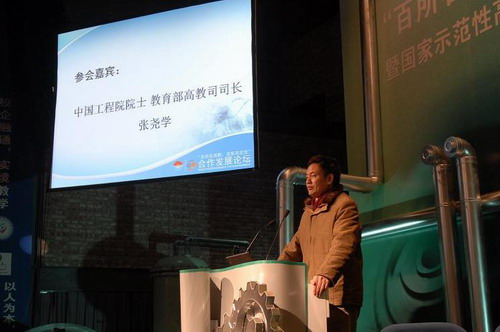 开幕式上,中国工程院院士、教育部高教司张尧学司长致开幕辞,并作了重要讲话:“非常高兴看到这么多的企业,特别是学生们能参加这次会议。国家示范性高职学校的建设在财政部领导的大力支持下进展得还比较顺利,但是也有很多难处,特别是新的模式、新的改革中间是有很多的困难和问题,需要大家共同去探索。实际上我们这种成果汇报会、演示会也是一种探索的方式,听说这次会议就是全部由我们学校的老师和学生自己来设计,把会议变成了实习的过程,这也是一种创新。当然大家非常勤苦,特别是房间里面凉风嗖嗖,又是北京寒冷的天气,坐在这里非常冷,但是不管怎么样我们是进行新的探索和改革。”