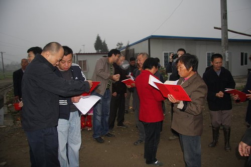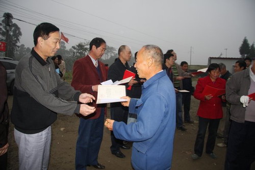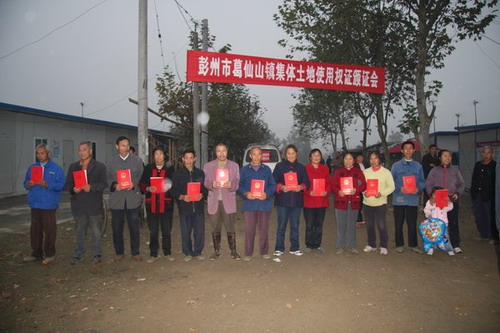 1027,彭州市葛仙山镇集体土地使用权证颁证会在葛仙山镇山泉村举行,应当地政府的邀请,我院党委委员、组织部长张予东、测绘系书记周建郑代表测绘突击队,和成都市、彭州市国土局有关领导共同为灾区农民颁发了集体土地使用证。