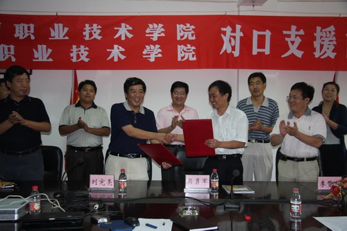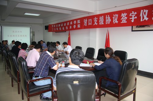 在行政楼二楼会议室,刘书记向客人介绍了我院的基本情况,并就我院“以就业为导向,以教学为中心,以专业建设为核心,教书育人、管理育人、服务育人、生产育人”的教育理念进行了详细的讲解。在随后的座谈中,双方就有关合作办学事宜进行了商谈,并签订了对口支援协议书。按照协议,我院与三门峡职业技术学院将在教师培训、学生培养等方面开展合作。