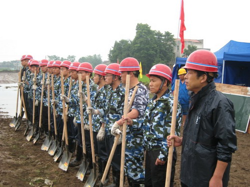 到达工地以后,队长胡修池一声令下,全体队员开始搭建自己住的帐篷。工作开始不久天下起了雨,突击队员冒雨奋战2个多小时,在傍晚7点30分搭起了三顶帐篷,并在抗震救灾的工地上竖起了我们自己的两面旗帜“黄河水院抗震救灾突击队”、“黄河水院抗震救灾众志成城”,此时突击队员已是饥肠辘辘,衣服全湿。之后,队员们在路边小店简单吃了些东西充饥。