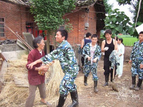 6月7日,在完成当天任务返回住所途中,路遇顺江村村民赖春荣求助,他家里只有两个80多岁的老人和两个妇女,自己无力安装政府发放的救灾帐篷。大家一致表示:再苦再累也要在天黑之前把老乡的帐篷搭好。于是,在万国平、郑丙茂、张洪老师的带领下,8名队员不顾一天的疲劳前往老乡家搭帐篷。老乡家的房屋部分倒塌,未倒塌的房子墙上也有较宽的裂缝,无法居住。8名队员首先将老乡自己用树枝和竹席搭建的破帐篷拆除,清理好现场后,在原地为老乡搭起了救灾帐篷。看着崭新漂亮的救灾帐篷,老乡非常高兴,80多岁的老奶奶拿出了面包蛋糕以示感谢,队员婉言谢绝。尽管队员们都很疲惫,但大家心里很高兴,因为通过自己的努力让灾区的一家人脸上露出了灿烂的笑容。