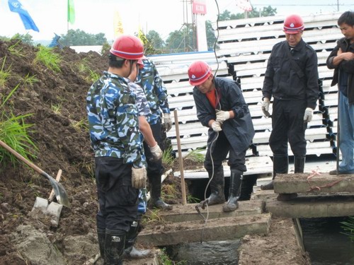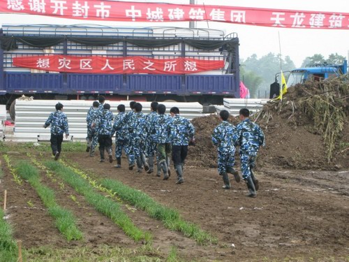 过渡安置房全部由轻型泡沫夹层板现成组装而成,安装速度较快,因此房屋基础建设才是决定安置房建设进度的关键。开封市抗震救灾前线指挥部要求,过渡安置房一期一批工程400套过渡安置房必须在本月24日前完成并交付使用。我们深切地感到任务的艰巨,形势的严峻。7点钟吃过早饭,胡修池队长就带领全体突击队员进入施工现场开始工作。