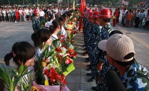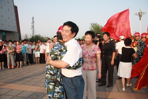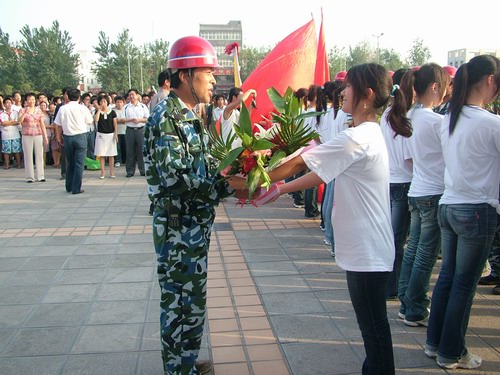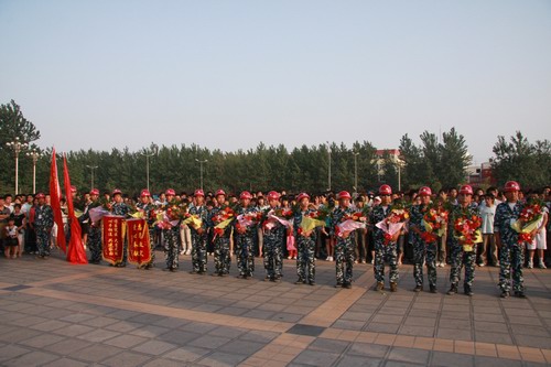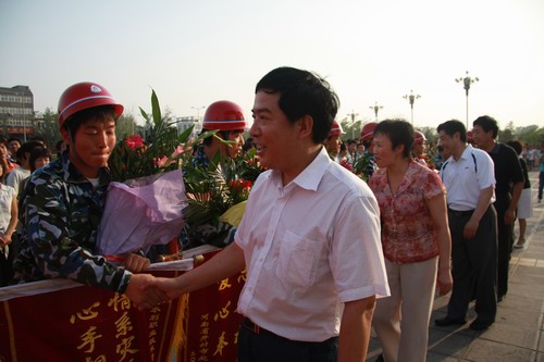 545分,队员们乘坐的3辆汽车终于出现在大家面前,人群沸腾了,19名救灾突击队员顿时被欢呼声、锣鼓声包围。“向英雄致敬!”、“向救灾英雄学习!”呼喊声在广场周围回响。爱心使者上前为19名队员献上了鲜花,学院领导和队员们一一握手,对他们表示慰问。