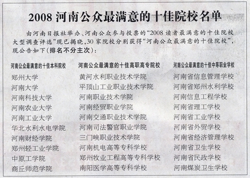 2008读者最满意的十佳院校”调查评选活动是由河南日报举办、河南公众参与投票的大型公众调查评选活动。此次活动本着“公开、公平、公正、有序”的原则,于331在《河南日报》刊登选票及参评单位,由读者进行投票、评选,同时接受社会监督,并由河南主流媒体组成互动媒体及时进行跟踪报道。
