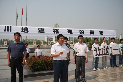 20085191428分,我院上空防空警报鸣响,院领导刘宪亮、张惠贞、孙五继、茹正波、王卫东、刘紫婷带领全院一万多名师生,和全国人民一起向四川汶川大地震遇难同胞默哀3分钟。