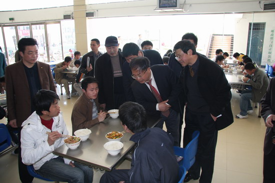 座谈结束后,调研组成员来到学生食堂,现场查看学生就餐情况。每到一处,调研组成员认真同学生交谈,询问是否拿到了临时补贴,饭菜有没有涨价,数量有无减少,质量和味道怎么样,能否喝到免费的米汤,当得到肯定和满意的回答后,调研组成员非常高兴,称赞我院的学生食堂工作做的好。