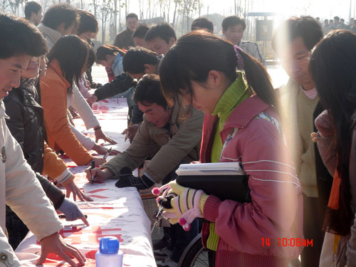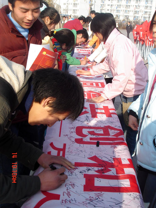 活动伊始,便取得了广大同学的积极响应,不到一个小时,一张条幅已完成签名,所有的字迹都代表着同学们最庄严的承诺。学生处处长菅浩然、副处长朱焕立等到签名活动现场对本次活动进行了指导。