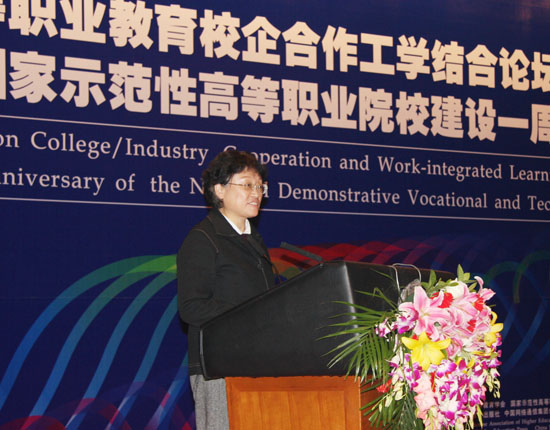教育部副部长吴启迪出席了26日下午的经验交流会,她对一年来示范院校建设取得的成绩给予了高度评价,指出这不仅是高职教育,也是整个高等教育改革发展的必由之路。她向校企合作双方表示新年问候,并希望广大高职院校特别是示范院校深入学习贯彻党的十七大优先发展教育,建设人力资源强国的战略思想,进一步明确定位,加强内涵建设,强化特色,提高质量,以高职教育又快又好地发展,促进经济社会又好又快发展。