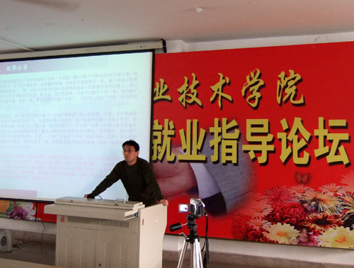 为了给企业和学院、学生提供一个交流平台,宣传企业文化和企业人才标准,转变师生就业观念,增强学生对就业市场的认识,指导学生正确择业、就业。118日至11日,我院特邀请校外的专家、企业家走进校园,围绕 “社会人才需求标准”、 “企业文化”、“学生就业观念的转变”、“高职学生的准确定位”等四个方面开展就业指导。