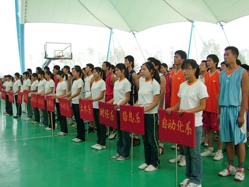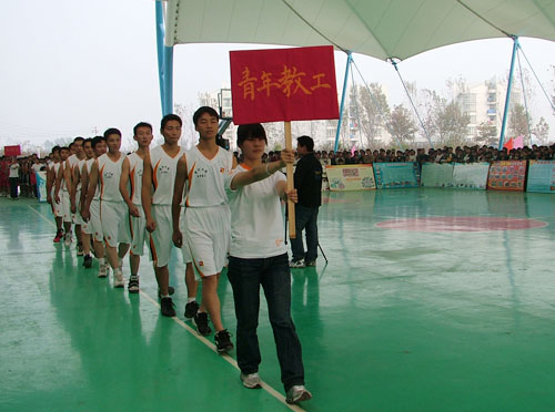 在雄壮的运动员进行曲中,13支代表队服装统一、精神抖擞地依次进入会场。其中,青年教工代表队最为引人注目,他们将同其他12支学生代表队一决高低。