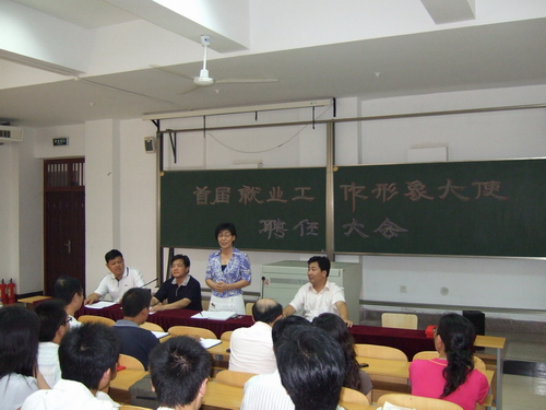 6月25日下午,我院首届就业工作形象大使聘任大会在教学楼6202隆重召开。刘紫婷副院长出席会议,学生处副处长于兆国、就业指导中心主任李纪宾、各系部主管学生工作的党总支书记、副书记,以及被选聘为首届就业工作形象大使84名2007届毕业生参加了会议。会议由学生处副处长陈志强主持。