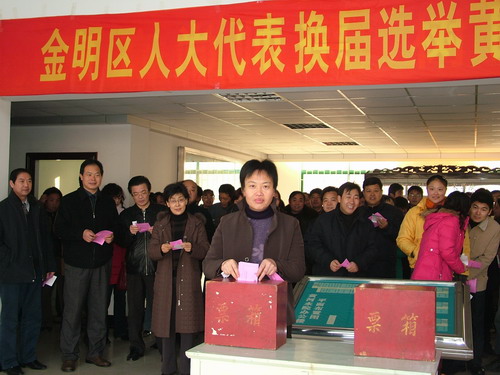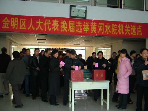 开封市金明区首届人民代表大会代表选举工作于2006年12月下旬拉开帷幕,我院对此项工作高度重视,随即成立了以院领导张惠贞副书记为组长、相关职能部门负责人组成的黄河水院选举工作领导小组,并抽调精干人员参加培训,专职负责选举工作。由于我院学生面临放寒假,经请示金明区人大选举委员会同意后,我院提前至1月18日进行了选举。选举当日,由金明区人大常委会副主任王文涛、金明区法院副院长刘海龙、西郊乡人大主席团主席孙萍等组成的选举工作督导组来院指导选举工作。我院师生员工以饱满的热情和严肃认真的态度投出了自己神圣的一票。整个选举工作规范高效、公开透明,得到了金明区选举委员会的高度评价。