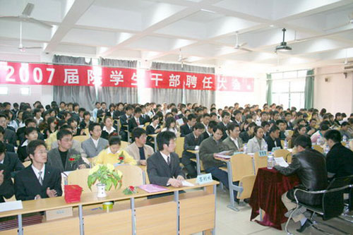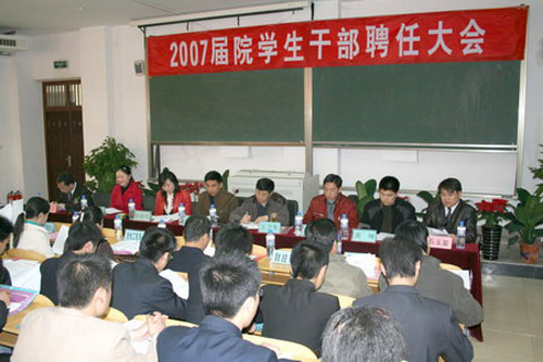 2007届院学生干部经过个人申报、民主推荐、组织考察、公开竞聘、院内公示,共选出团委学生干部19名、院学生会干部67名。与会领导和老师为新当选的86名学生干部颁发了聘书,并对机电工程系学生分会、财经系学生分会、管理系学生分会、土木工程系学生分会等四个优秀学生分会以及朱文娟、陈中华等十名优秀学生干部进行了奖励。